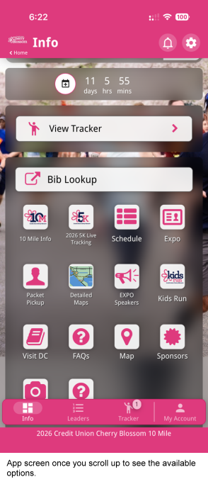 Once you have downloaded the app, you will see icons for the Upcoming Races – 10 Mile and 5K (if you are in the Double Blossom, you will no doubt want to switch back and forth between races).