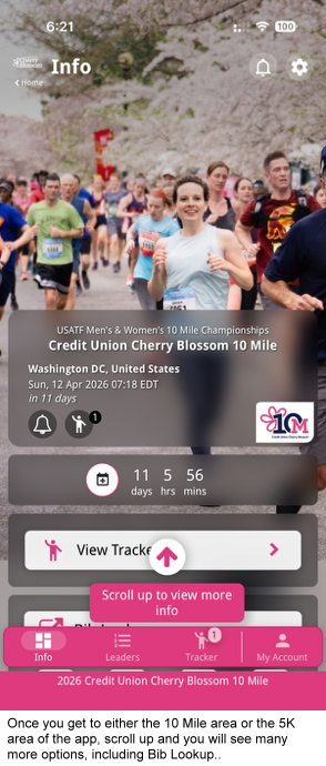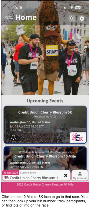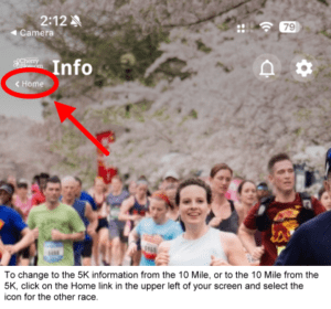 Switch to Another Race: If you are in either the 10 Mile or 5K areas of the app and you want to switch to the other race, click on the small <Home> link at the top left to the left of Info and just under the very small Cherry Blossom logo (see image at right). Then select the icon for the race you want to see more info for.