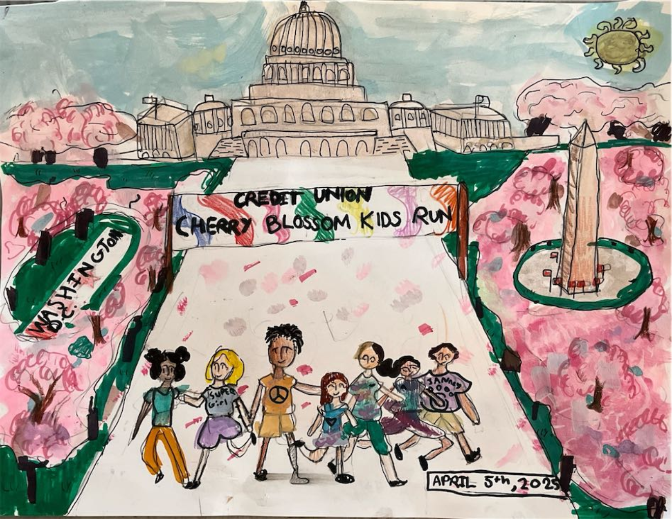 Ava Bricken, age 10, is a 4th Grader at Janney Elementary School in DC. She has a creative spirit and from an early age she has loved to create art – especially scenes with characters. From diners in a Parisian cafe to magical witches making potions, she draws them all. She is proud to add Cherry Blossom runners to her repertoire. When not making art, Ava enjoys playing soccer with her pals, acting in the school plays, and jumping on the trampoline with her big sister, Lilly.