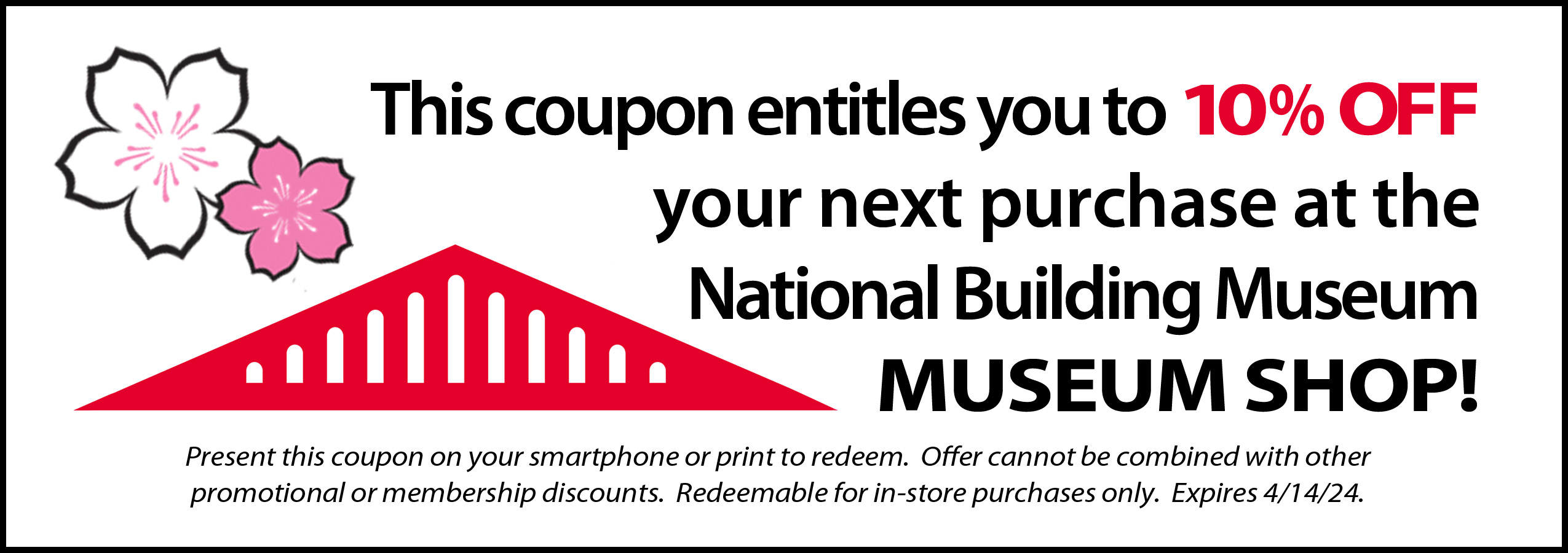 Use the coupon below to get 10% off any purchase at the National Building Museum’s Museum Shop (the National Building Museum is the site of the 2024 Credit Union Cherry Blossom Health & Fitness Expo and where most of you will be going to pick up your bib number). Just print the coupon or display it on your smartphone to receive the discount. Offer good until April 14, 2024.