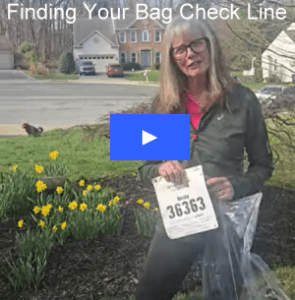 Step 2: Determine Your Bag Check Line! Your bib number that you receive at Packet Pickup has your Bag Check Line and Bag Check Space printed on it in the top right corner and in the bottom right corner of your bib number. Click Here to see exactly where on your bib you can find this information.